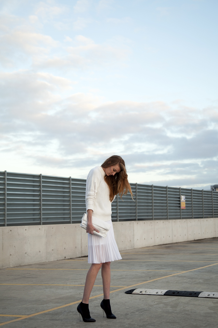 In Outfit on June 21, 2014 BLANC Wearing | Topshop knit & skirt | Marlo clutch | Steve Madden heels | Country Road socks Shot by Zien Creative By AmyHamilton / 1 Comment