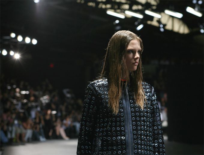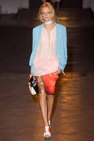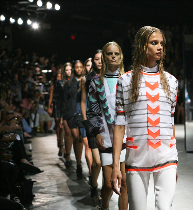 Rag & Bone to me is something of a phenomenon, in their ability to meld two contrasting looks into a brilliant vision of layer upon layer of colour and texture. With Electric Blues and Oranges dominating the colour palette, geometric prints, sheer fabrics and textured knits the Spring collection is an ode to the 90s surfer chick (note the goggles), who inspired the show. I have never seen Parachute Ponchos, Neoprene and Classic Tweed Blazers work so effortlessly well together.