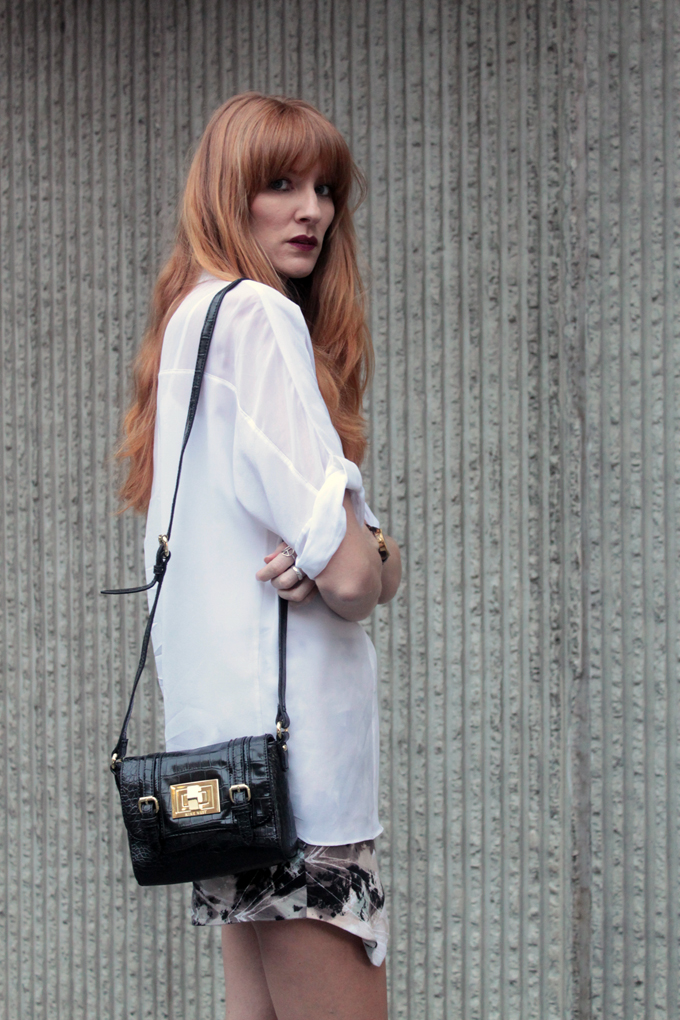 Wearing Witchery OCRF Shirt, Stylestalker Galactica Skirt, Nine West Bag, Nine West Boots, Michael Kors Watch