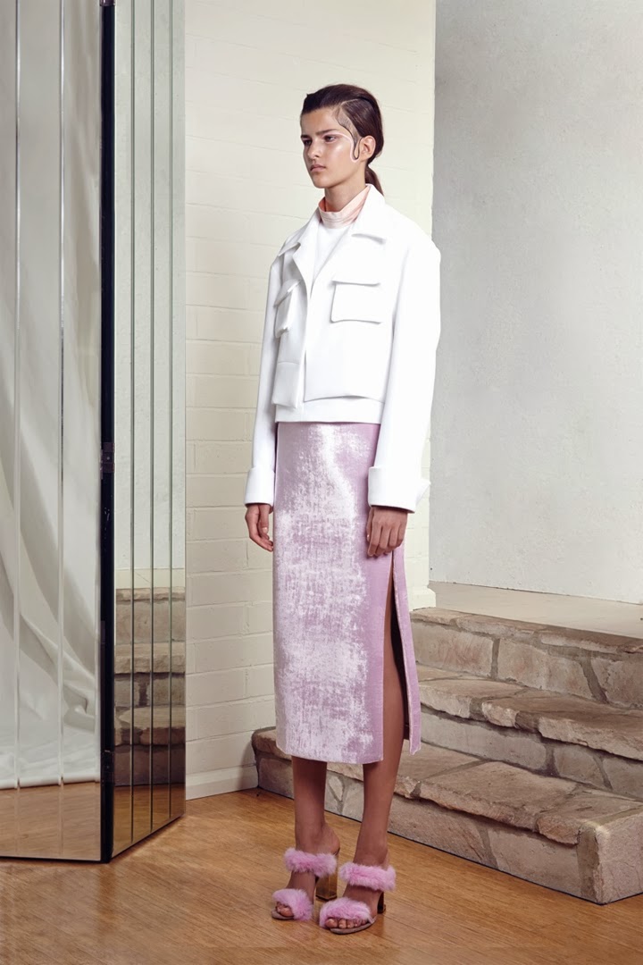 Its pretty easily forgivable to be thinking about Winter on a 33 degree day when you’re staring at the new offering by home grown talent, Ellery. Suffice to say I’m completely smitten with this entire collection, the knee length skirts with thigh splits combine demure with modern, the exaggerated bell sleeve, clearly inspired by those incredible bell bottoms we saw in the SS14 collection, and the opposing forces of structure and drape of almost every piece plays on proportion, which we all know is Kim Ellery’s strong point.
