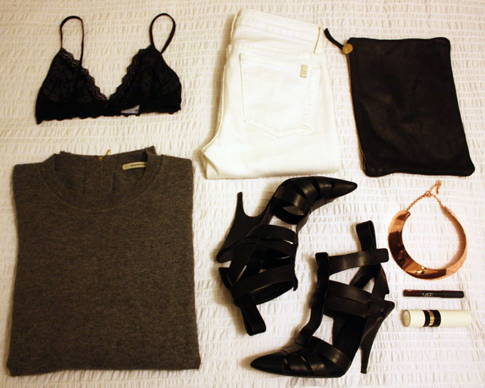 Go to outfit; Eberjay Bralette, Country Road Knit, Joes Jeans, Nicholas ‘Ruby’ Choker, Alexander Wang ‘Danica’ Heels, Claire Vivier Clutch, Nars ‘Train Bleu’ velvet matte lip pencil, Gucci Flora, Fragrance for home, Vintage Fur and Penguin Classics, Artwork, Over flowing wardrobe, Bambi, Winter Fragrance.