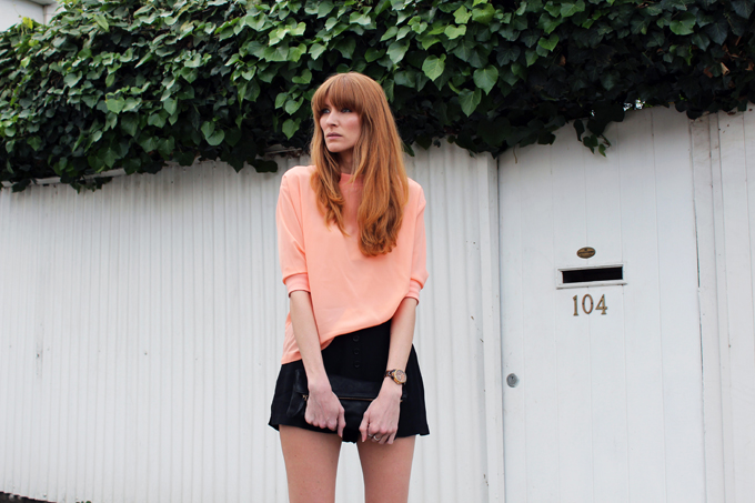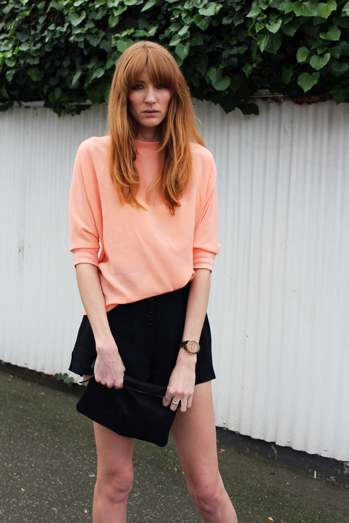 In case you haven’t noticed I’m not a big colour person, I usually stick to the basics of Grey, Black and lots of White. But every now and again I feel the urge to inject some colour into my outfits and I seek out something the I know I’m not going to feel to unlike myself in. The Anguish T-shirt from the Maurie & Eve Spring 13 Loveless collection ticked all the boxes for me, the slouchy-ness of the silk and the modern shape give this top a relaxed but dressed up appeal, while the soft peach hue adds a hint of colour, which is more than welcomed in this bleak Winter. Oh and yes this also comes in Black and White, both of which are high on my must have list.