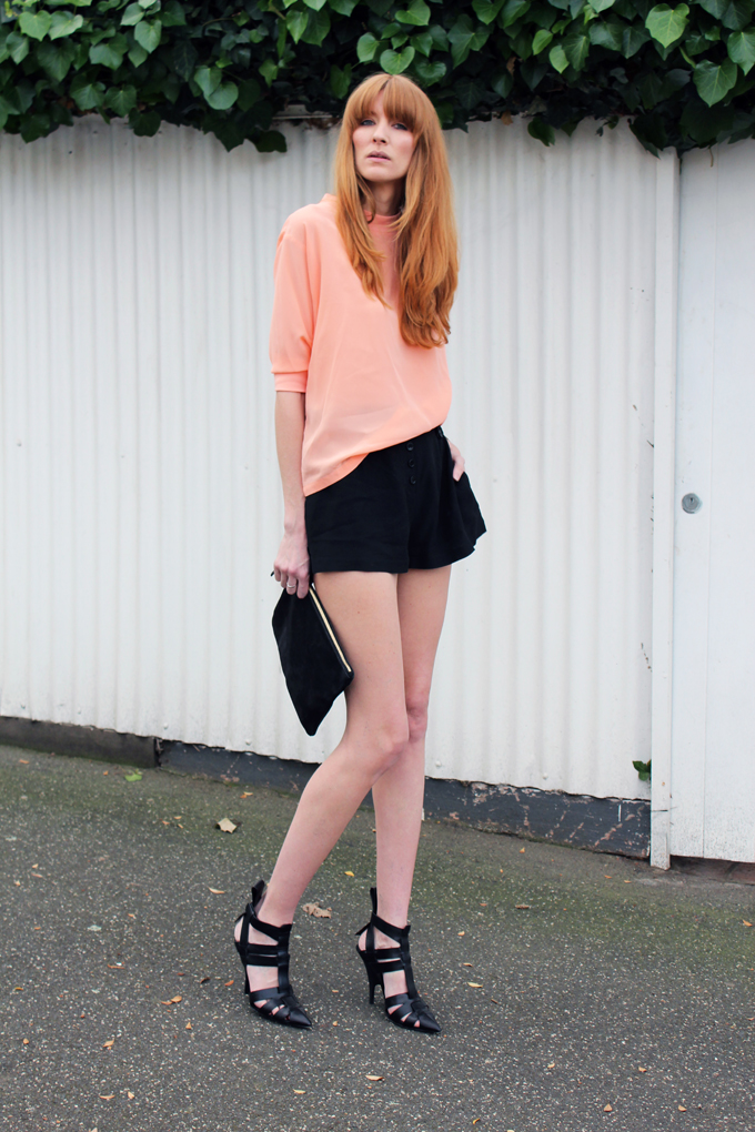 Wearing; Maurie & Eve Anguish T-shirt, Something Else Shorts, Alexander Wang Heels, Claire Vivier Clutch