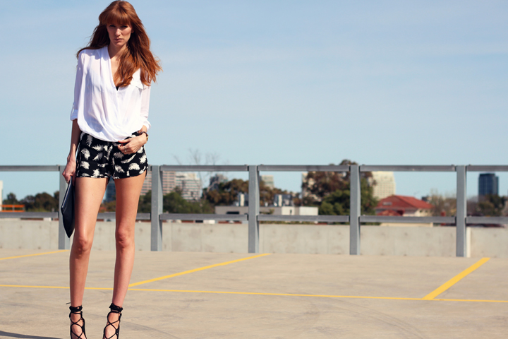 I can’t describe how excited I was for the first day of Spring! (if you follow me on Instagram you may have seen me captured in a slightly silly moment jumping for joy on top of this roof top car park) It seemed like we had been waiting forever for a decent amount of sunshine, and shine it did. We couldn’t have asked for a more perfect start to September, and after battling wind and rain for months, postponing shoots due to inclement weather, and freezing my fingers and toes off whilst parading around in bare legs all in the name of fashion, it was refreshing to bask in the warmth of the southern sun. This outfit perfectly summed up my mood, palm print shorts and a fresh white floaty shirt, which billowed perfectly in the breeze. Refresh, regenerate, renew.